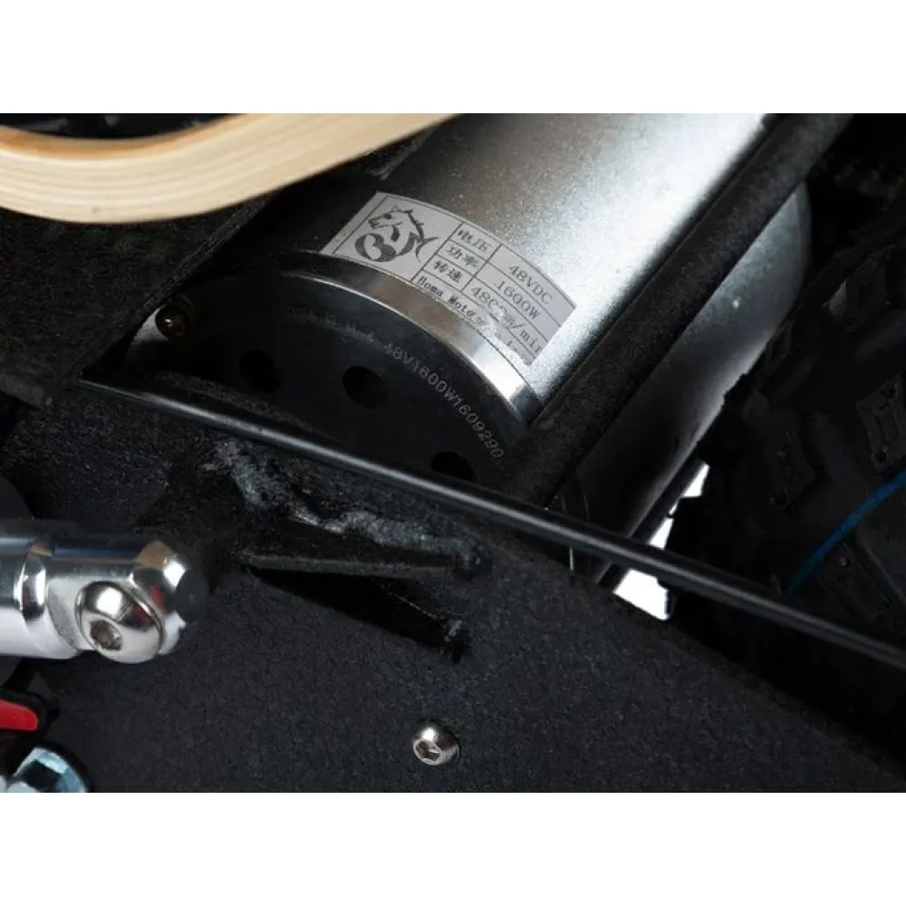 Техника питается от свинцово-кислотного АКБ емкостью 20 Ач напряжением 60 В. Батарея быстро зарядится за 8 часов и рассчитана на преодоление 35 км пути. Год выпуска аккумулятора - 2023. Быстрый разгон до 45 км/час возможен благодаря электродвижку с задним приводом мотор-колесо мощностью 1600 Вт. Удобное сидение имеет анатомически правильную форму. Задние амортизаторы снижают вибрацию от нагрузки наезда на ямы.
