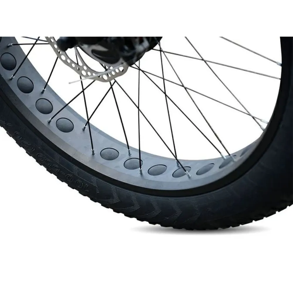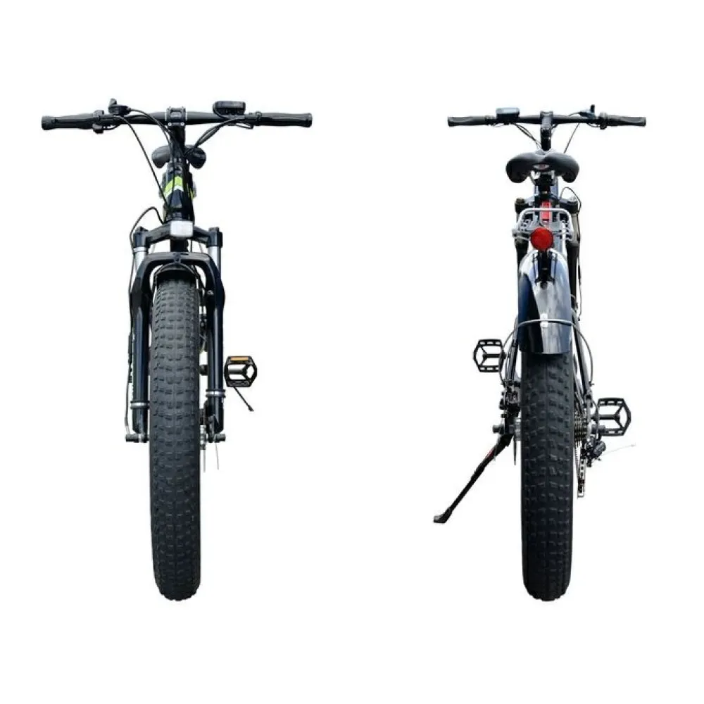 Фэтбайк оборудован двумя электромоторами в сумме выдающие 1000 Вт благодаря подаче питания от емкой батареи. АКБ быстро снимается при необходимости и имеет короткий цикл зарядки всего 6-8 часов, емкость также позволяет проходить на одном заряде до 30 км. Тип привода полный цепной гарантирует разгон за секунды до 30 км/час. Сидение средней жесткости задумано для полного комфорта пользователя.