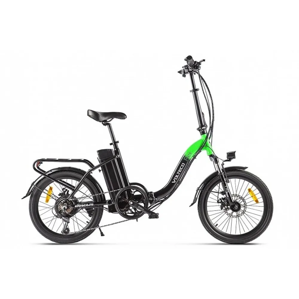Велогибрид VOLTECO FLEX – складной вариант электровелосипеда для которого всегда найдется место в доме. Легкий по весу транспорт предназначен для езды по городской и загородной местности. Велик легко управляется, прост в обслуживании. Имеет длительный срок службы, не ломается благодаря оригинальной технической новинки. На этапе изготовления производитель позаботился о защите электровелосипеда, удобстве и безопасности ездока.  Предлагаемая нашим магазином модель в черно-зеленых цветовых оттенках выглядит стильно и современно. Из технических преимуществ стоит отметить следующие: